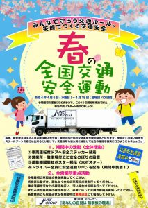 毎年、新年度を迎える4月以降は新入学児童・園児の歩行中の交通事故が増加傾向となります。学校近くの狭い路地やスクールゾーンの通行は出来るだけ避けて、交差点等も進入時に減速して左右の確認を確実に行うようお願いします。